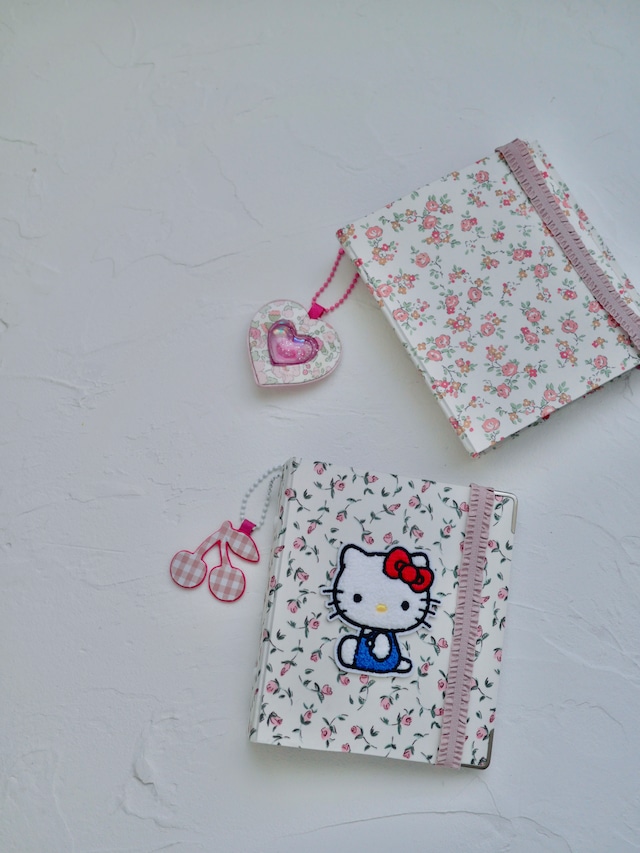 カルトナージュで作るシール帳の 通信レッスンキットです 初心者様でも作りやすい平面作品です たくさん作ってお友達とシール交換を楽しんでくださいね 【サイズ】 B7サイズ 閉じた状態 横12×縦14×幅2.5 【キットに入っているもの】 厚紙 ケント紙 リボンテープ(ピンク) バインダー金具 コーナー金具 ハトメ お選びいただいた布×ピンクリネン 【ご自身で準備するもの】 ハケ ボンド ハサミなど ※キティちゃんのワッペンは参考です ※ハートチャームの作り方ははいっておりません ※さくらんぼチャームがセットになっています リボンをつけたり、ガチャのキーホルダーをつけたり お好きにアレンジを楽しんでください ※レッスン、販売ライセンス付きです